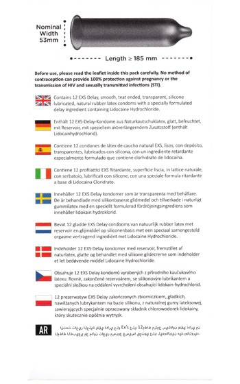 Kondomen är belagd med silikonbaserat glidmedel på ytan, och inuti finns ett bedövande ämne för att mildra känsligheten. På så vis får du njuta längre och prestera bättre, samtidigt som du effektivt skyddar dig mot både sjukdomar och oönskad graviditet. EXS Delay är mest lämplig för dig med en penisomkrets på mellan 11 och 12 cm.